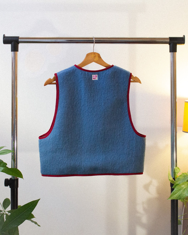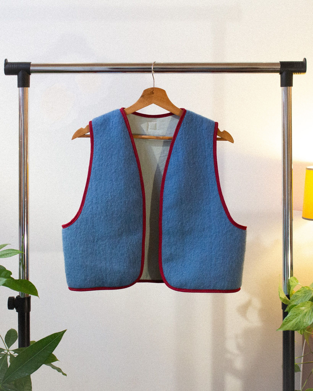 Ce gilet est fabriqué à la main en France, à Mâcon, avec des tissus (lainages) issus de récupération !