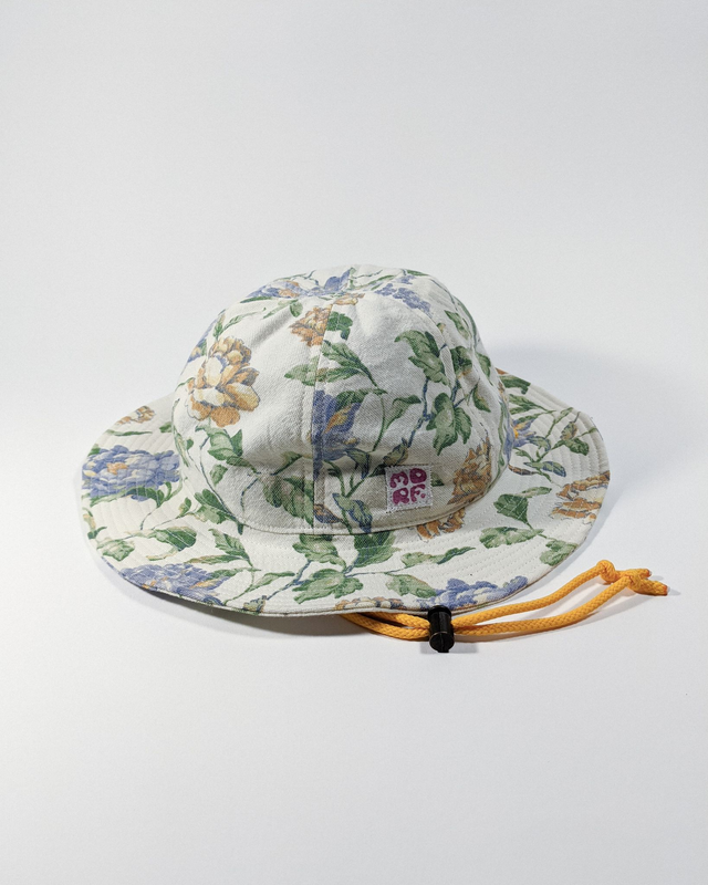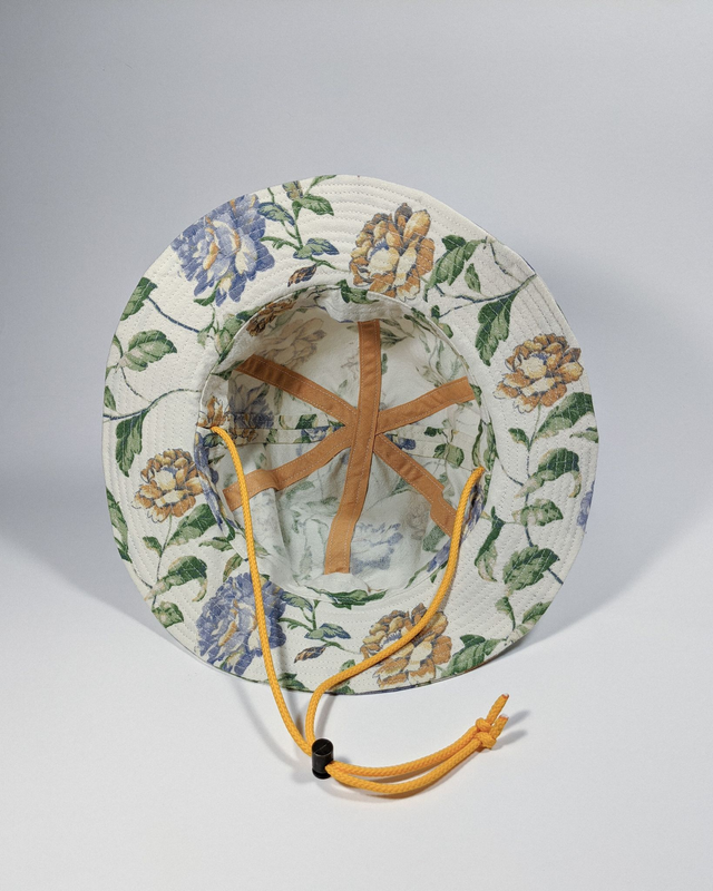 La partie supérieur est englobante mais pour éviter qu'il ne s'envole avec le vent, un cordon vient faire le tour de la tête pour se serrer en bas du menton. La visière est plate et doublée pour qu'elle garde une bonne rigidité !