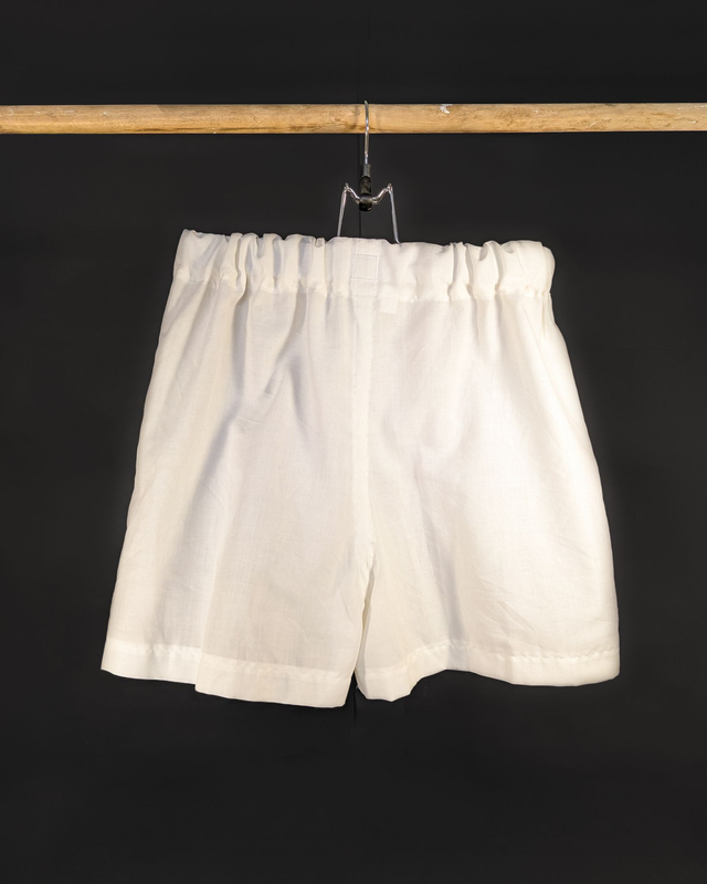 Ce short est fabriqué à la main en France, à Mâcon, avec des tissus (draps, rideaux) issus de récupération !