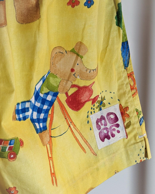 Ce short (taille M) est fabriqué à la main en France, à Mâcon, avec des tissus (linges de lit) issus de récupération !